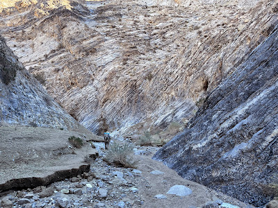 Death Valley is famously hot, dry, and barren, but cold temperatures, flooding, and bushwacking posed challenges during a short visit in January 2023. The park is nothing if not diverse, with elevations ranging from 292 feet below sea level in Badwater Basin to over 11,000’ at the summit of Telescope Peak, so it's not surprising that conditions don't always match the cliches. When I met Larry Scritchfield for a little mid-winter backpacking (and to escape the relentless Wyoming cold), high temperatures averaged around 60 in the basins, way warmer than the surrounding mountains where we hiked, many blanketed with snow.